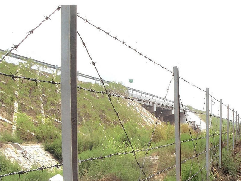 刺鐵絲隔離柵是一種新型防護網。該產品具有嚇阻效果好、美觀、施工便利.經濟實用等優異特點。刀片刺繩防護網主要用于園林公寓、機關單位、監獄、哨所、邊防等的圈禁防護。刀片刺繩防護網由銳利尖角鍍鋅鋼板或不銹鋼薄板做刀片,高張力鋼絲做芯線組合而成的阻絕器材。由于刀片刺繩防護網造形獨特不易觸摸,因而能達到極好的防護隔離效果。直線形刀片刺網由刀片型直線刺網交叉焊接成型,可用于防盜窗、高速護欄、隔離柵。施工迅速、效果顯著。刀片刺繩防護網,有多種架設方式可供選擇,施工迅速,既省經費,又可達到嚇阻的效果。